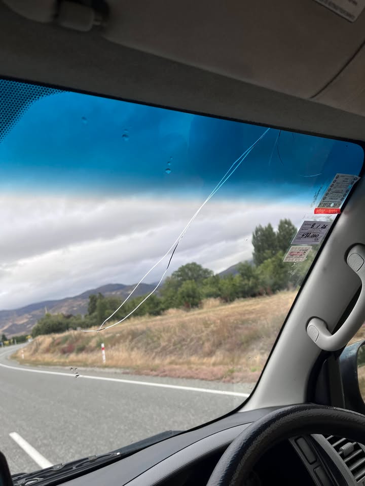 交叉了!擋風玻璃的裂縫居然延伸交叉了!趕緊和 AI 討論,考慮我們的行程,最近的維修點在皇后鎮附近。